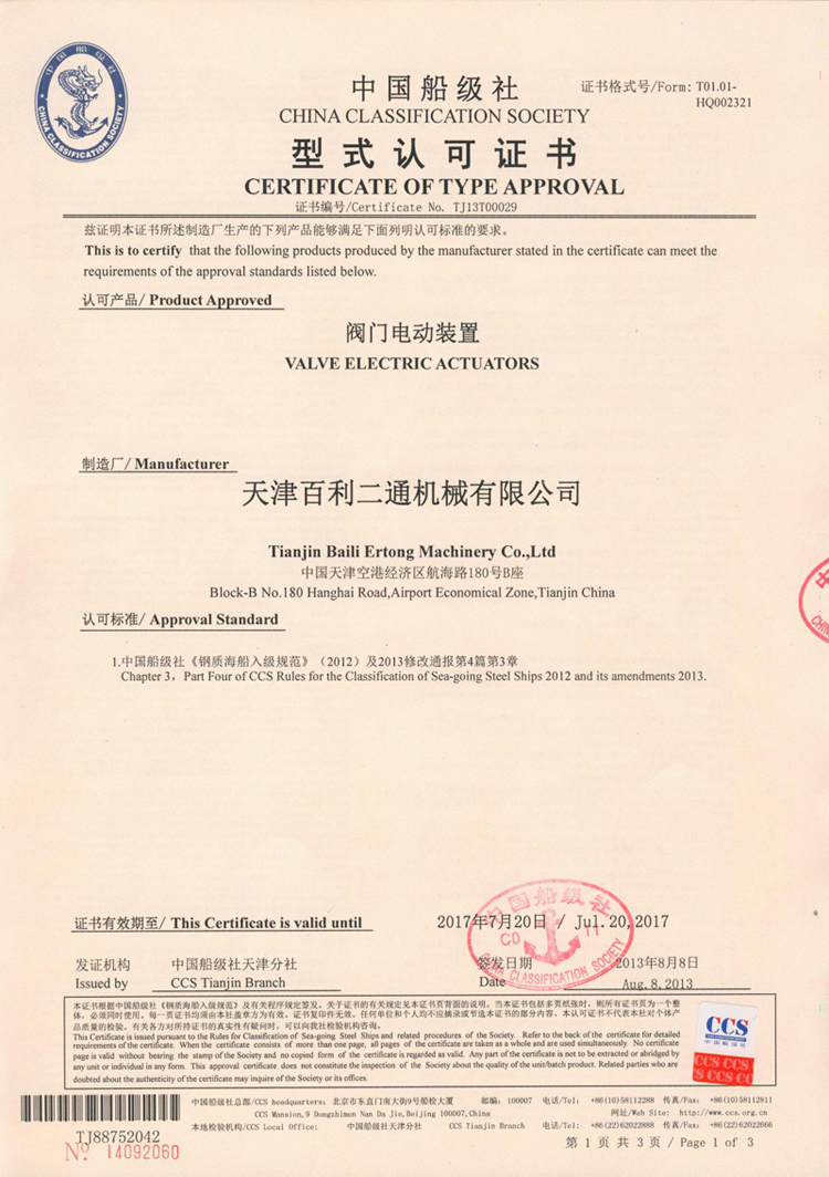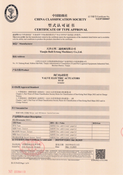 中國(guó)船級(jí)社型式認(rèn)可證書