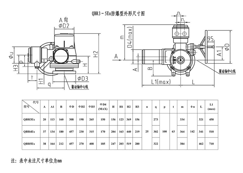 QBR3~QBR5是我公司研制的部分回轉(zhuǎn)閥門電動(dòng)裝置,控制轉(zhuǎn)矩范圍:900N.m~12000N.m。該電動(dòng)裝置可與球閥﹑蝶閥等閥瓣做90°回轉(zhuǎn)的閥門組合成電動(dòng)閥門,其功能是控制閥門的啟閉。該電動(dòng)裝置能夠進(jìn)行單機(jī)或多機(jī)室內(nèi)控制遠(yuǎn)距離控制電動(dòng)操作和現(xiàn)場(chǎng)手動(dòng)或電動(dòng)操作,可廣泛地應(yīng)用在具有管道閥門的工業(yè)系統(tǒng)。該產(chǎn)品的防護(hù)等級(jí)為IP67,隔爆型產(chǎn)品(型號(hào)中有Ex)的隔爆等級(jí) 為dⅡBT4。