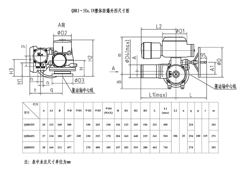 QBR3~QBR5是我公司研制的部分回轉閥門電動裝置,控制轉矩范圍:900N.m~12000N.m。該電動裝置可與球閥﹑蝶閥等閥瓣做90°回轉的閥門組合成電動閥門,其功能是控制閥門的啟閉。該電動裝置能夠進行單機或多機室內(nèi)控制遠距離控制電動操作和現(xiàn)場手動或電動操作,可廣泛地應用在具有管道閥門的工業(yè)系統(tǒng)。該產(chǎn)品的防護等級為IP67,隔爆型產(chǎn)品(型號中有Ex)的隔爆等級 為dⅡBT4。